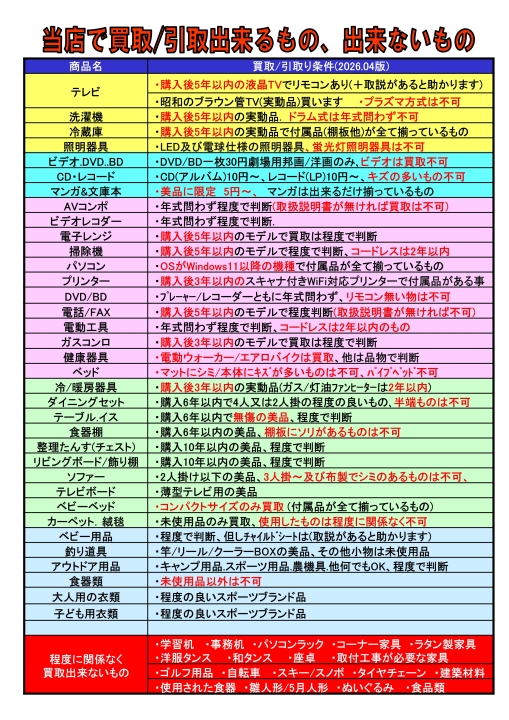 買取基準一覧表